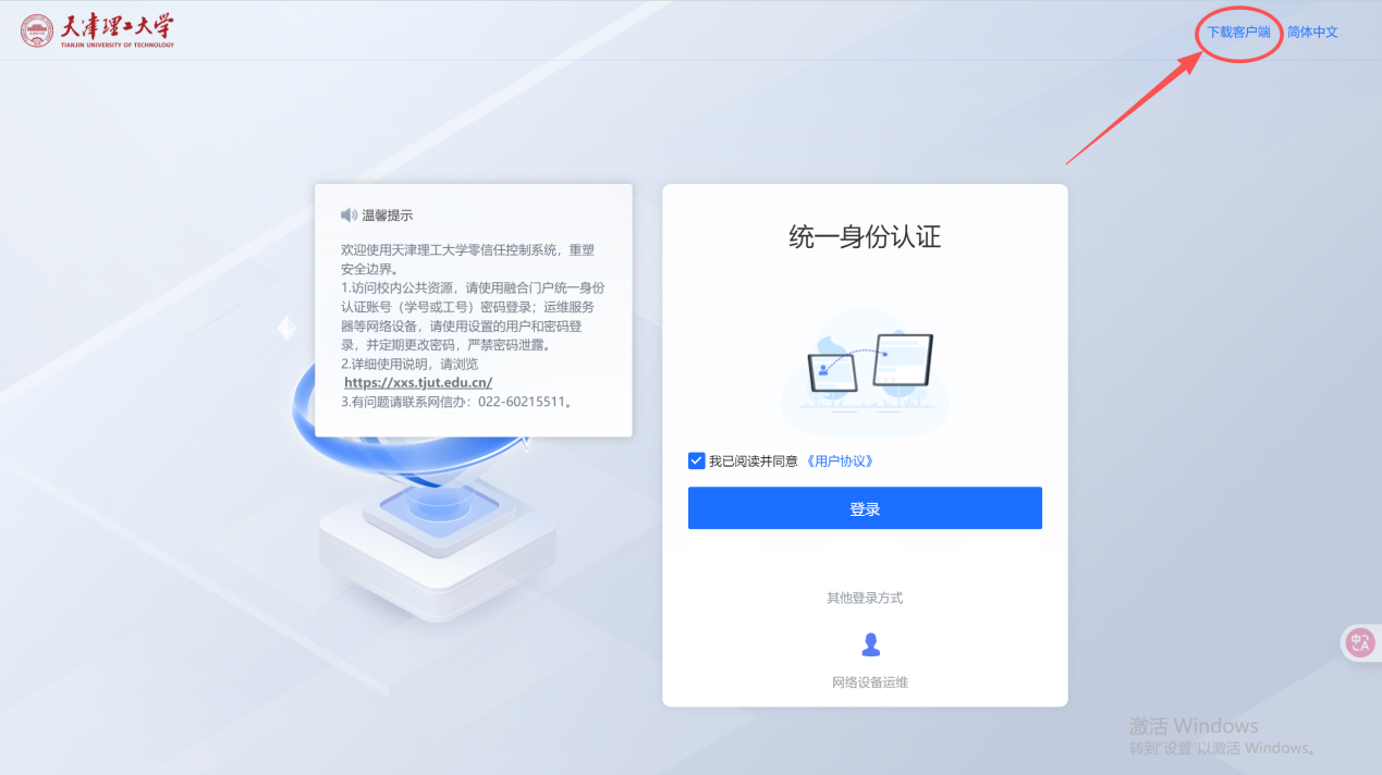未安装过EasyConnect客户端的,打开浏览器,在地址栏输入https://vpn.tjut.edu.cn,进入零信任访问控制系统登录页面。在图3中单击页面右上角的“下载客户端”,即可看到支持的所有终端版本(包括鸿蒙、IOS、Android、MacOS、Windows),在图4中按需选择对应版本下载。