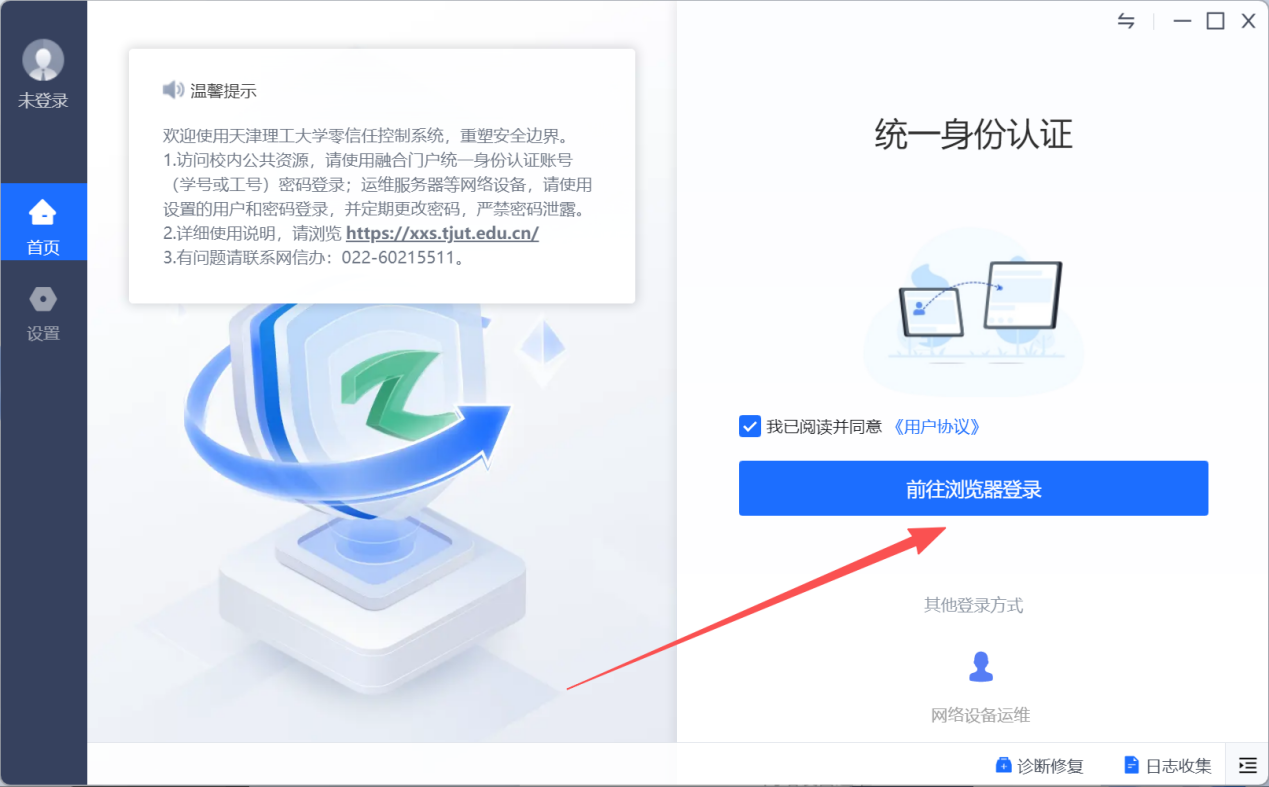 该方式为默认登录方式,使用融合门户统一身份认证账号(学号或工号)密码登录。单击图11中的【前往浏览器登录】,浏览器自动打开统一身份认证登录,如图12所示。
